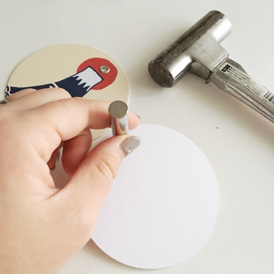 穴を開けて、金具を入れたら金槌で叩くだけ♫