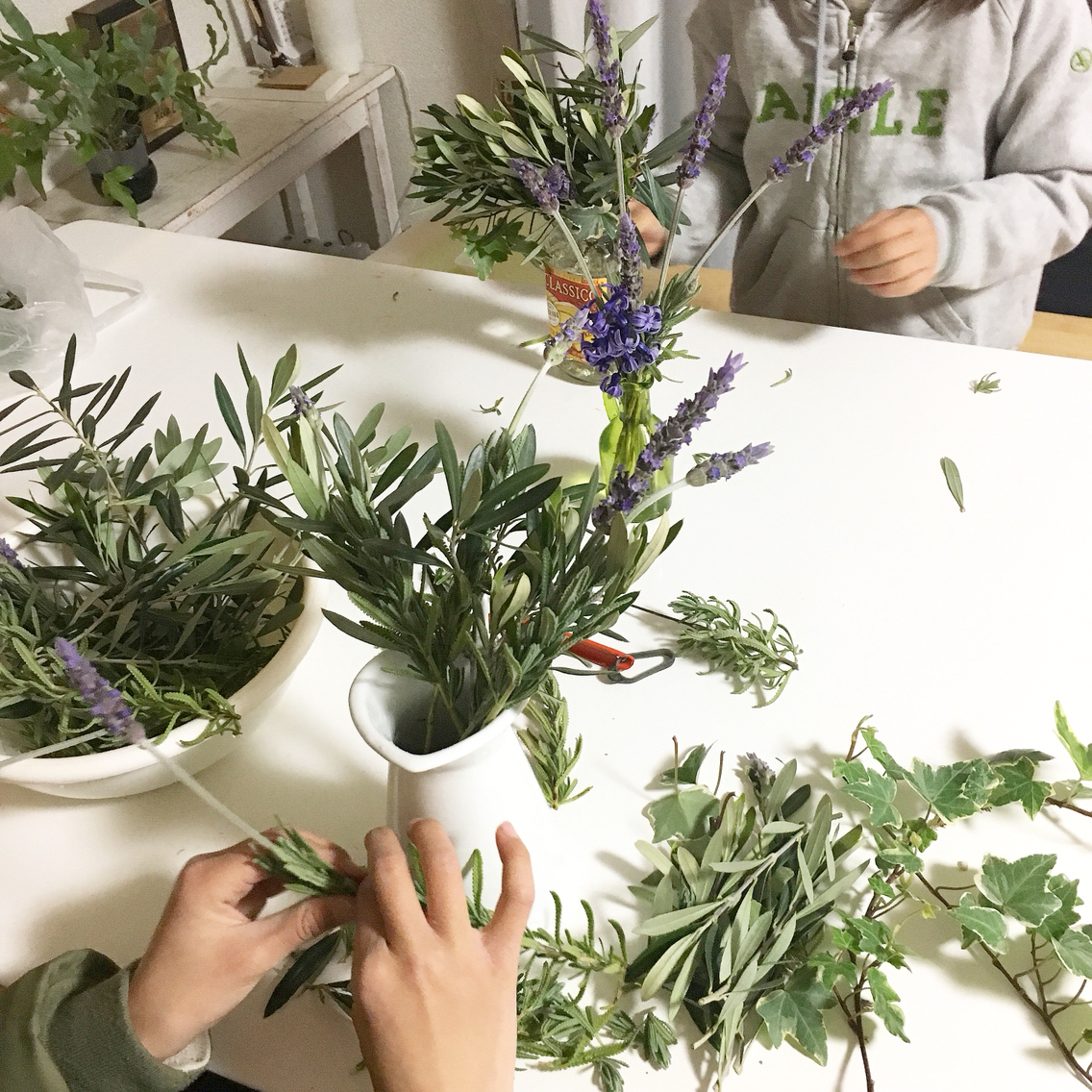 おうちじかんも、唯一庭に咲いているオリーブとラベンダーを盛り盛り刈って来て…植物遊び。