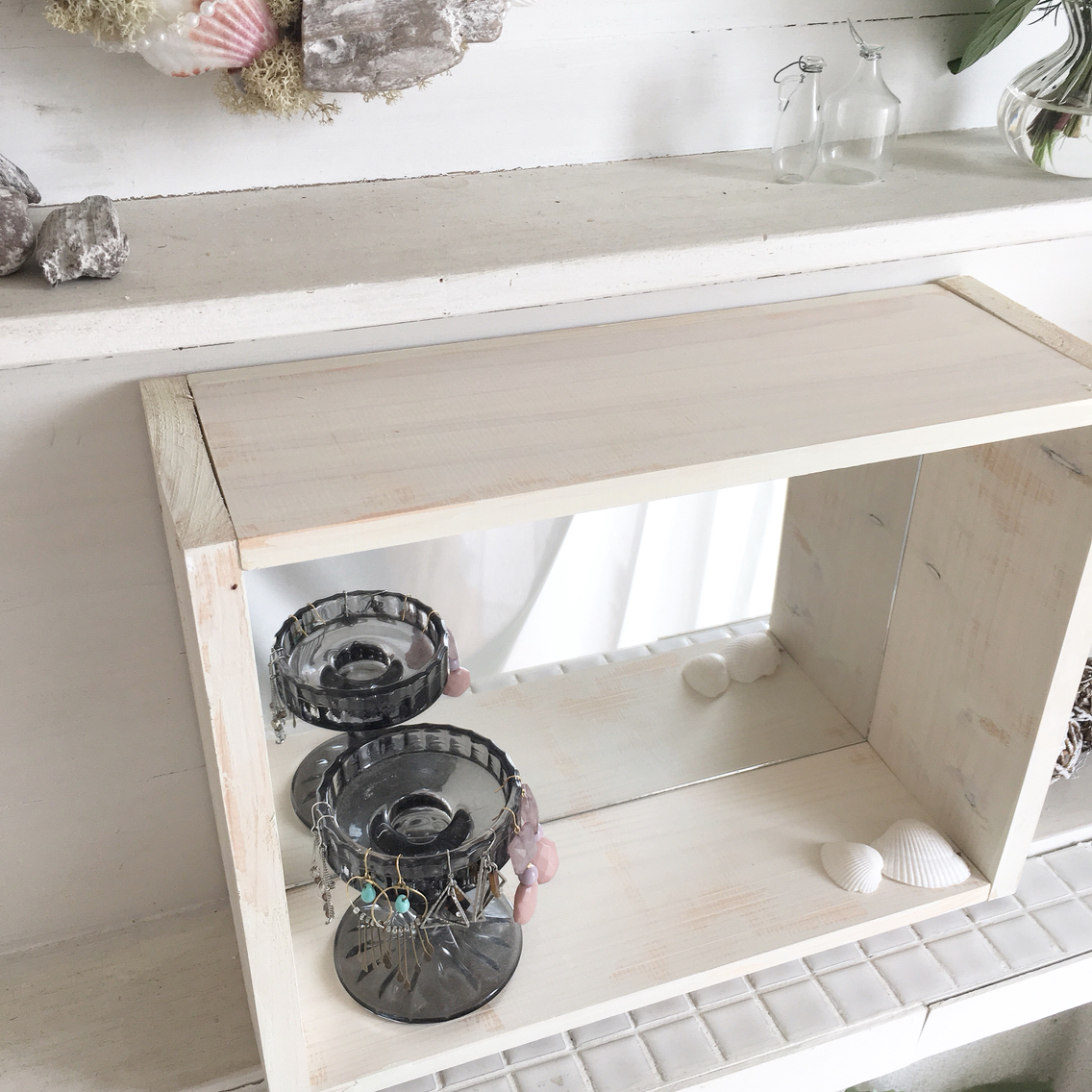 鏡付きなので、アクセサリー置きにしても。