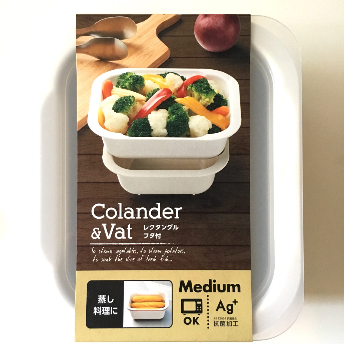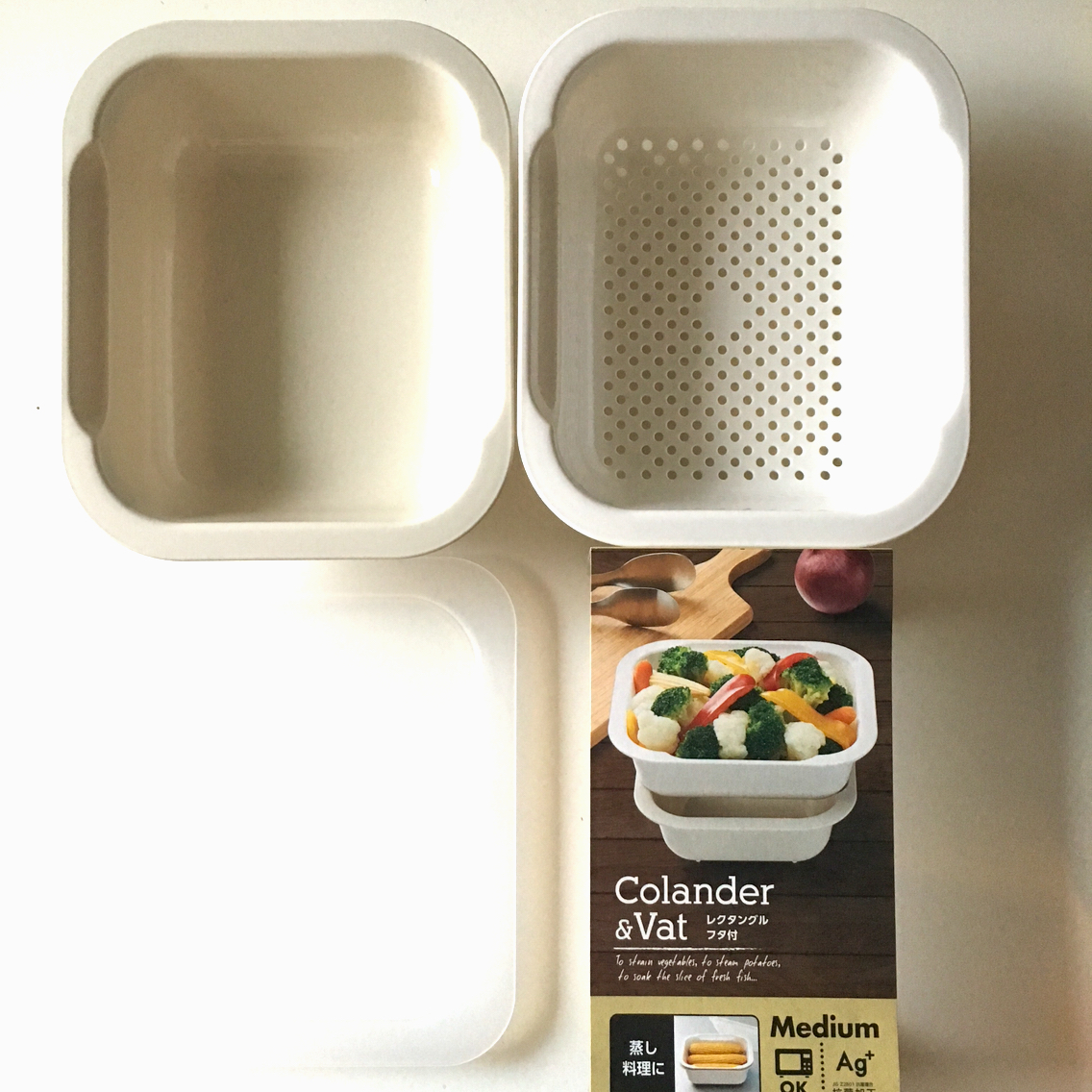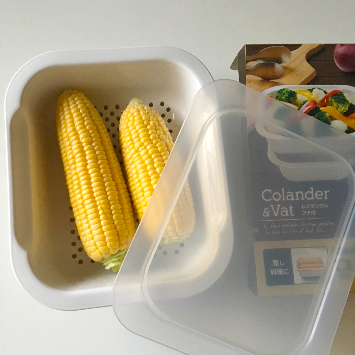 バットにコランダー(ザル)をセットし、材料と水を入れて蓋してレンジでチン♫