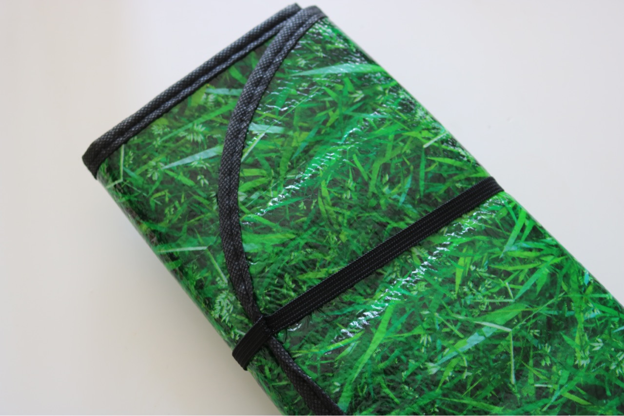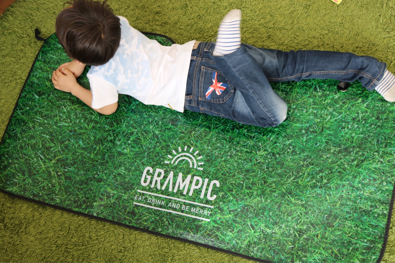 芝生のような絨毯に芝生柄のサンシェードを敷いて…
