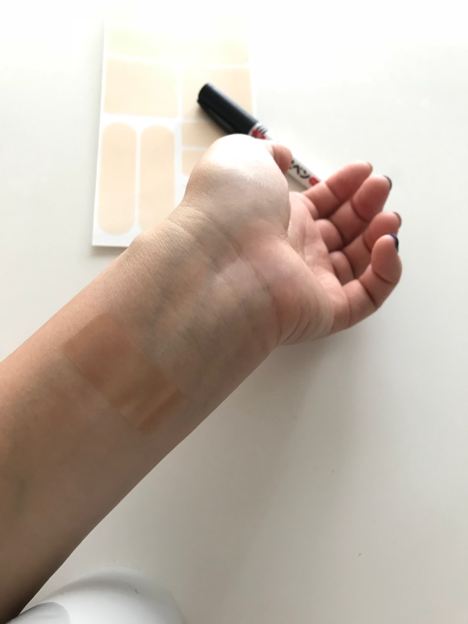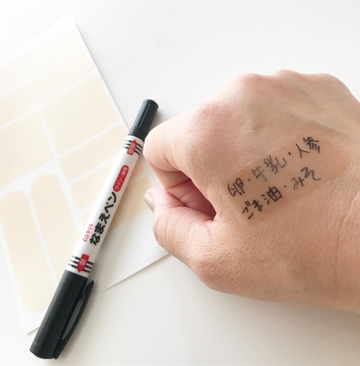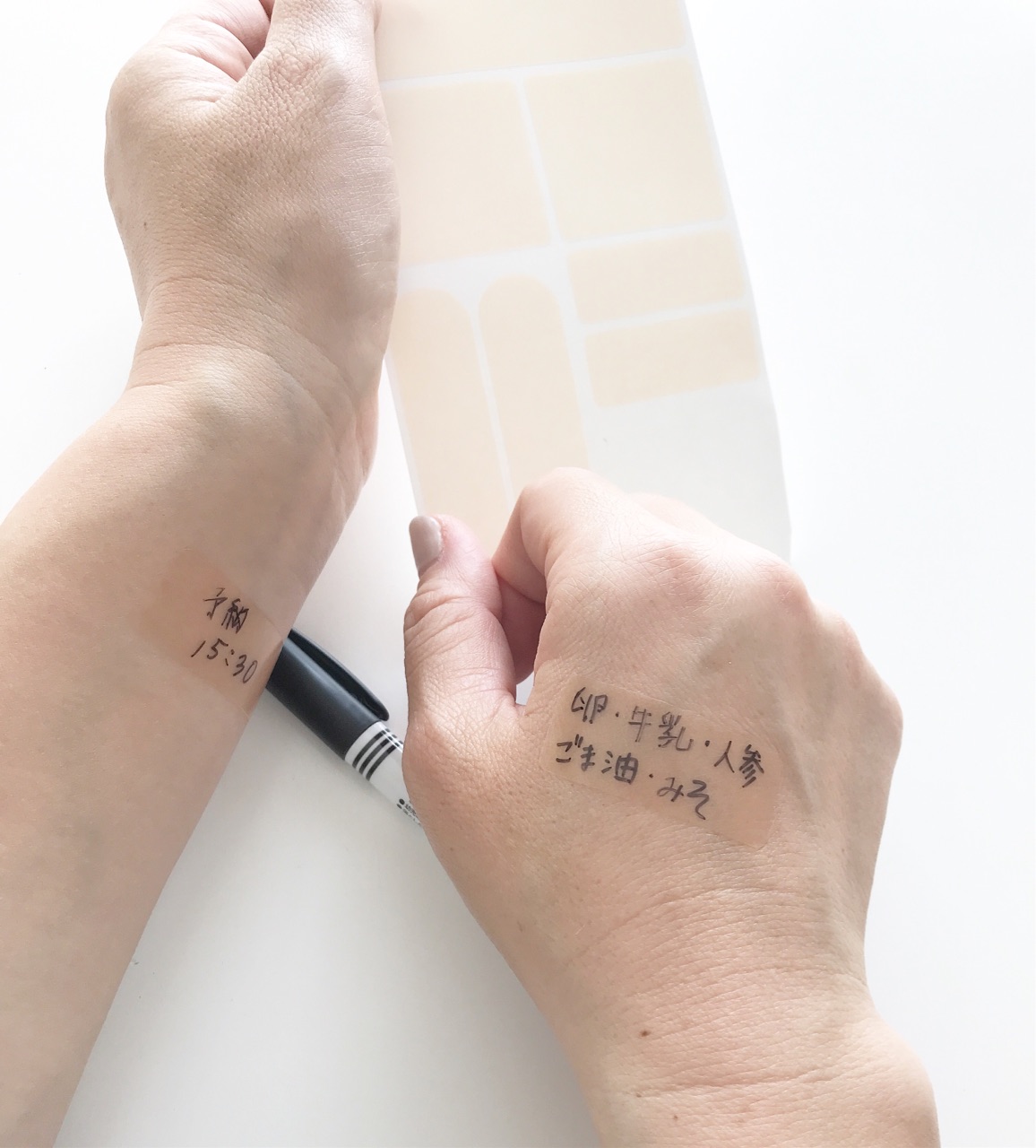 素肌に貼って、メモしたい時に油性ペンなどでそのまま手に書く感覚でメモできる!という。