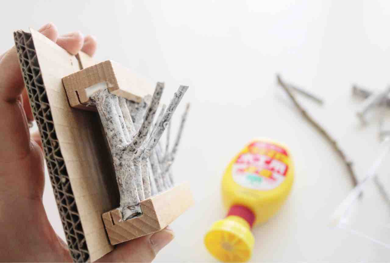 広いほうのくぼみを利用し、小枝をはさんで固定していきます。