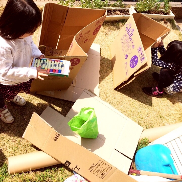 外では無料で頂いてきた大きいダンボールで家づくり遊び。